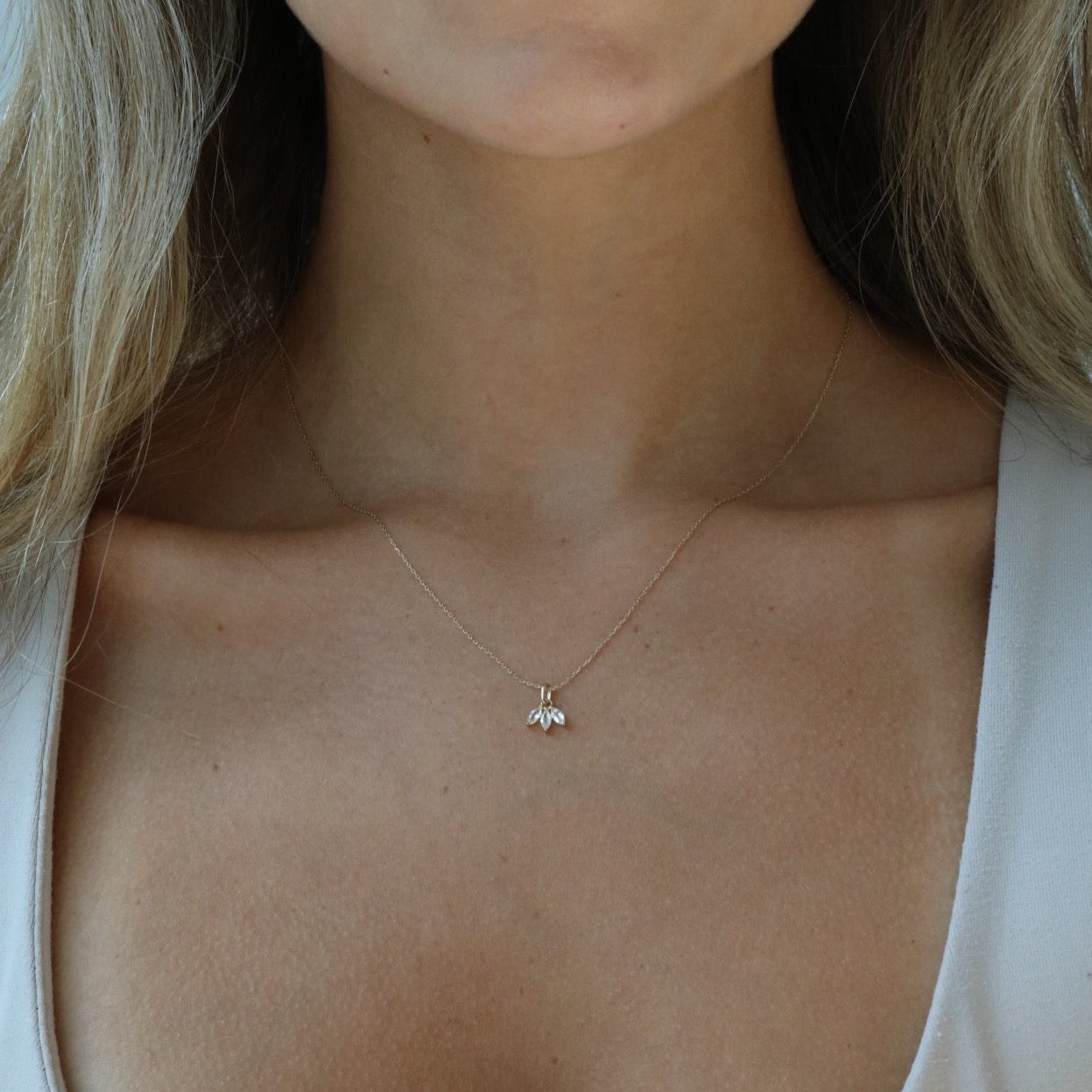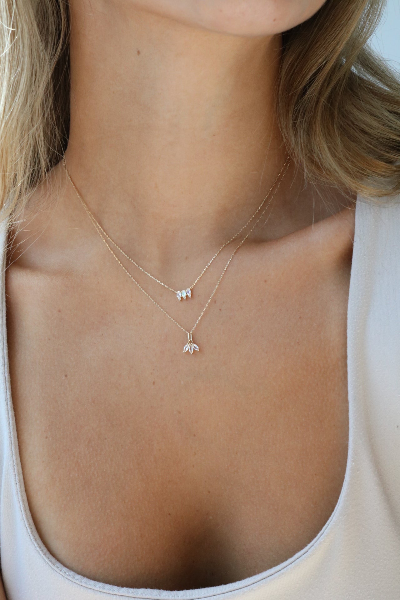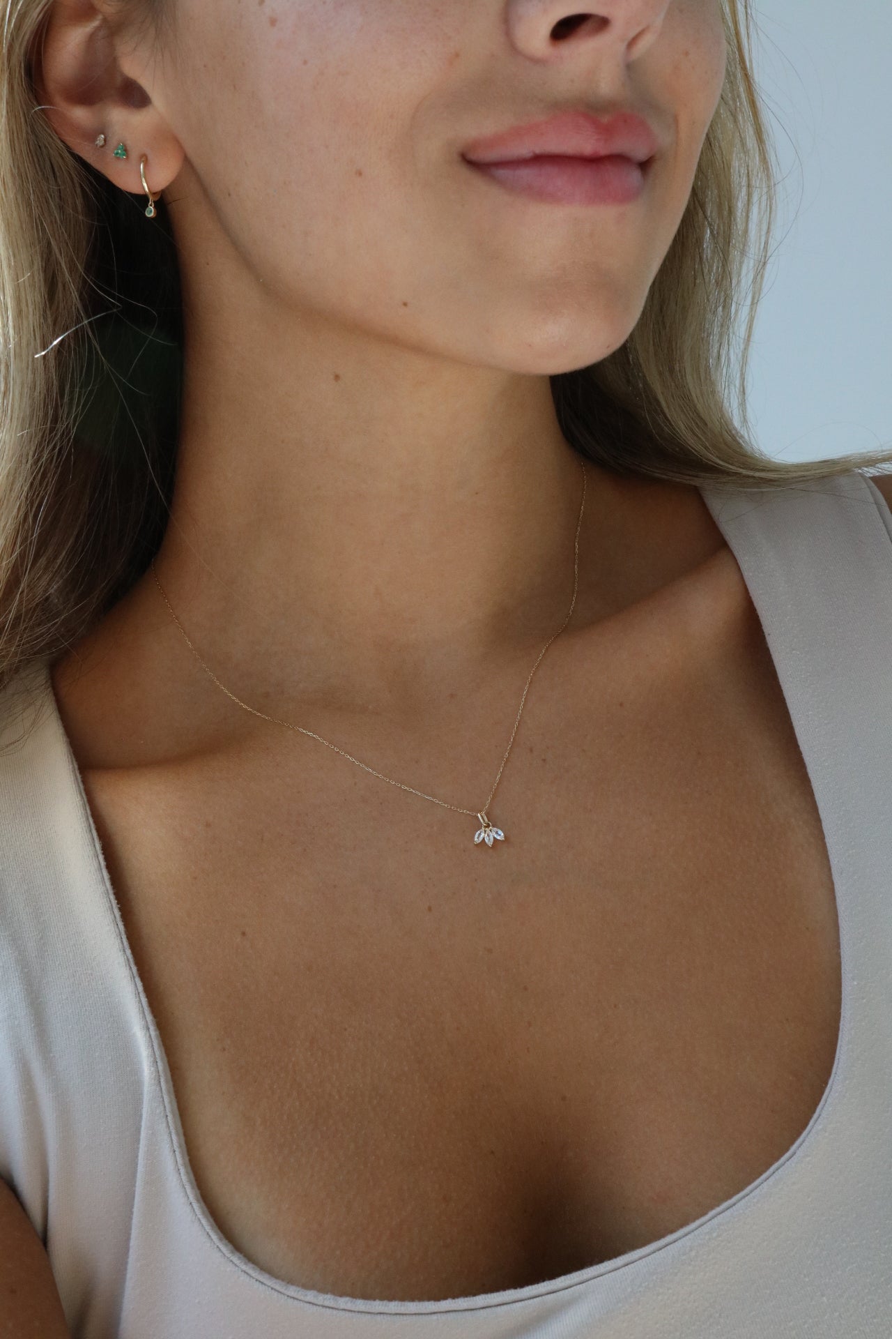 This dainty 14k gold Alexia White Topaz Necklace is quite stunning and elegant. This triple marquise white topaz cluster gleams and shines brilliantly in the light. Perfect for stacking and daily wear.