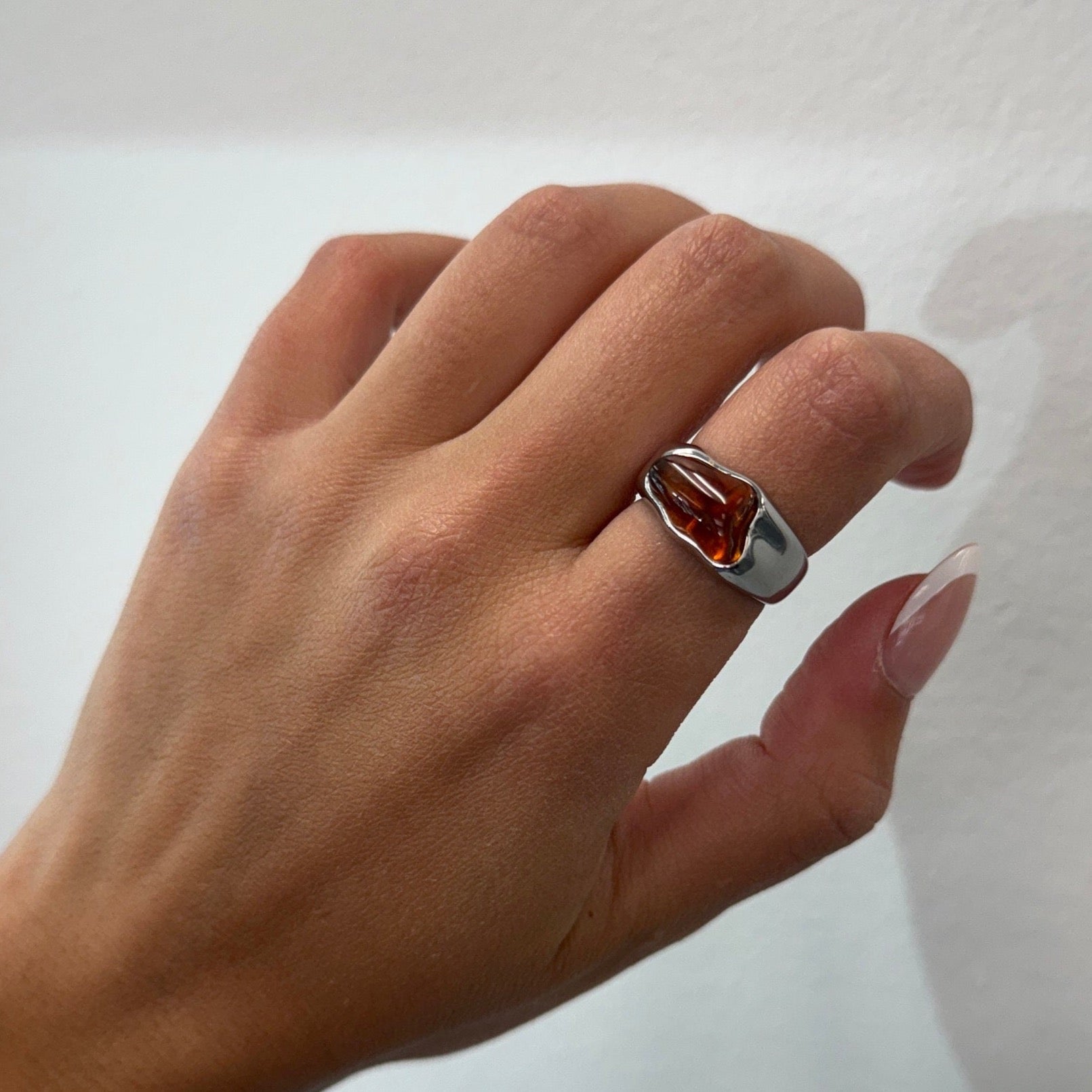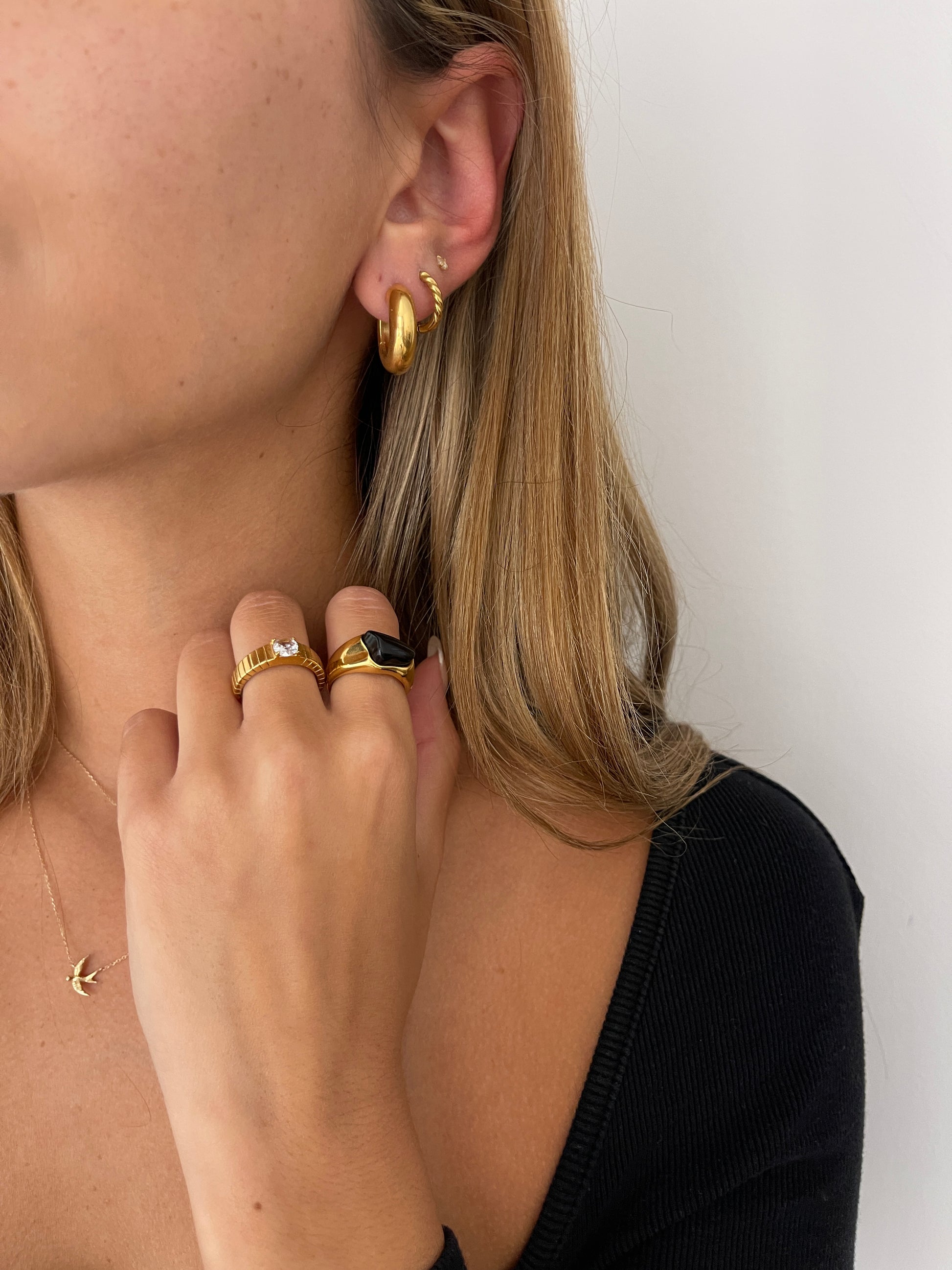 This beautiful and bold 18k gold band ring, adorned with a natural agate stone, makes for a perfect statement piece to add to your jewelry collection. Its thick and chunky design makes for an eye-catching accessory that is sure to turn heads. A stunning natural stone ring crafted with 18k gold, this gorgeous piece of jewelry is sure to complete any ensemble.